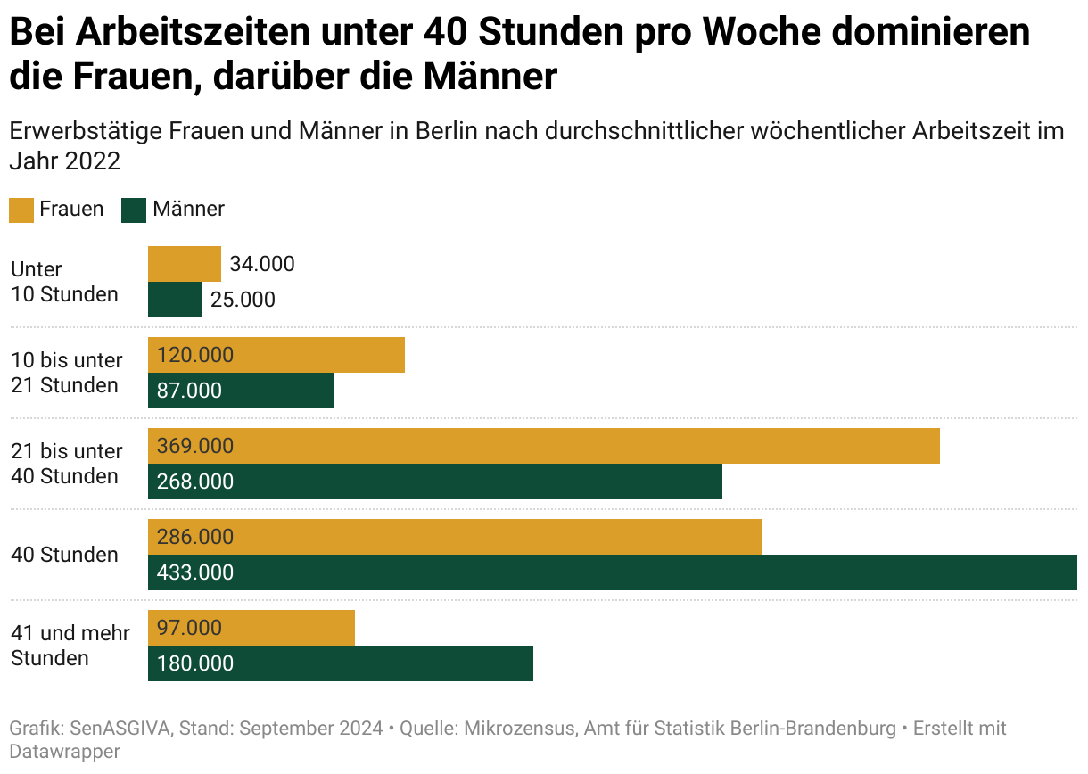Der überwiegende Teil der Frauen arbeitet 21 bis unter 40 Stunden die Woche, im Jahr 2022 waren es etwa 369.000. Bei den Männern gibt der größte Teil eine 40-Stunden Woche an (im Jahr 2022: 433.000).