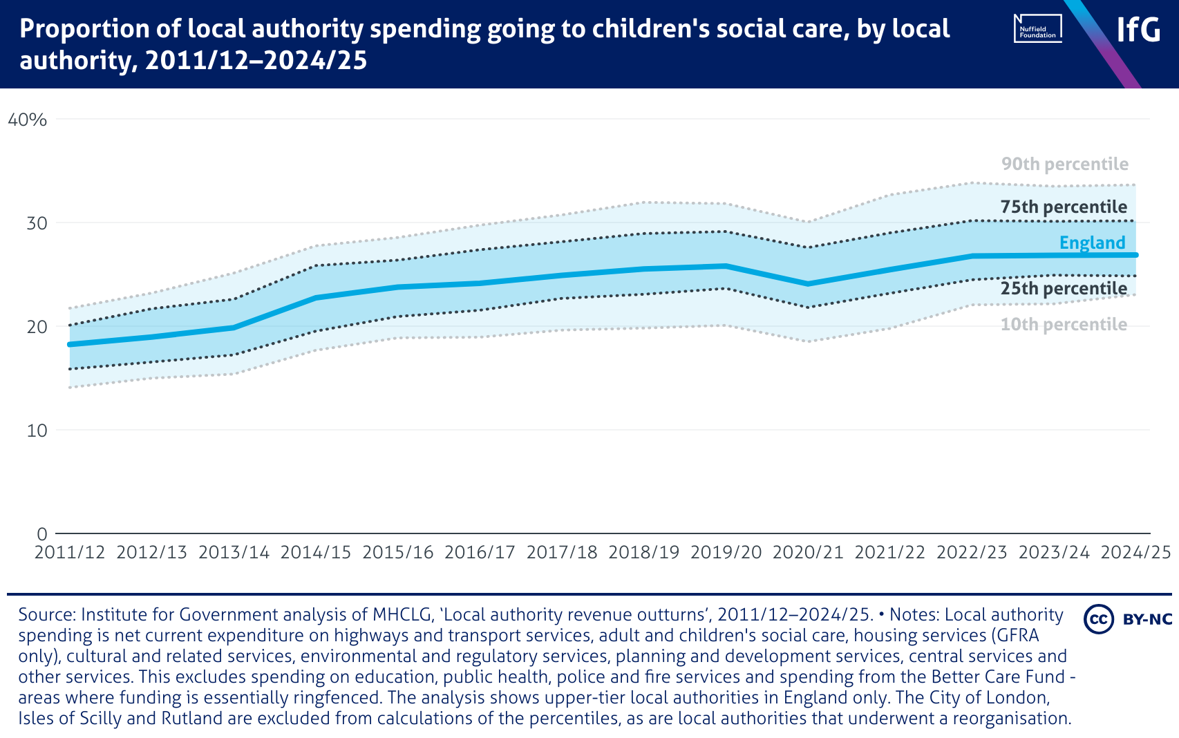 A line chart from the Institute for Government showing proportion of local authority spending going to children's social care, by local authority, 2011/12–2024/25, where the share in England has risen from 18% to 27%, with the 90th percentile at 34% in 2024/25, and the 10th percentile at 23%.