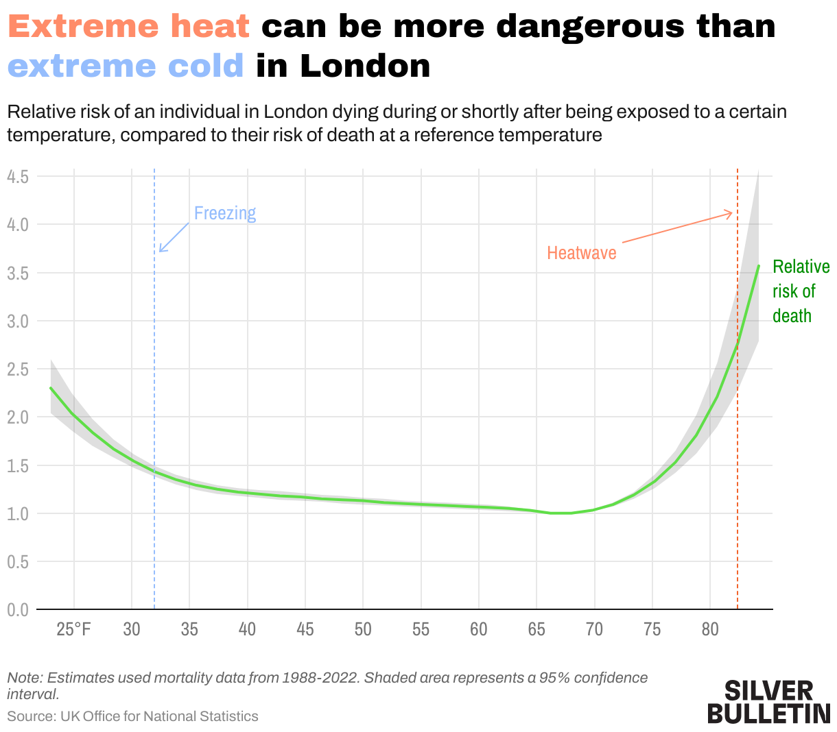 Relative risk of an individual in London dying during or shortly after being exposed to a certain temperature, compared to their risk of death at a reference temperature