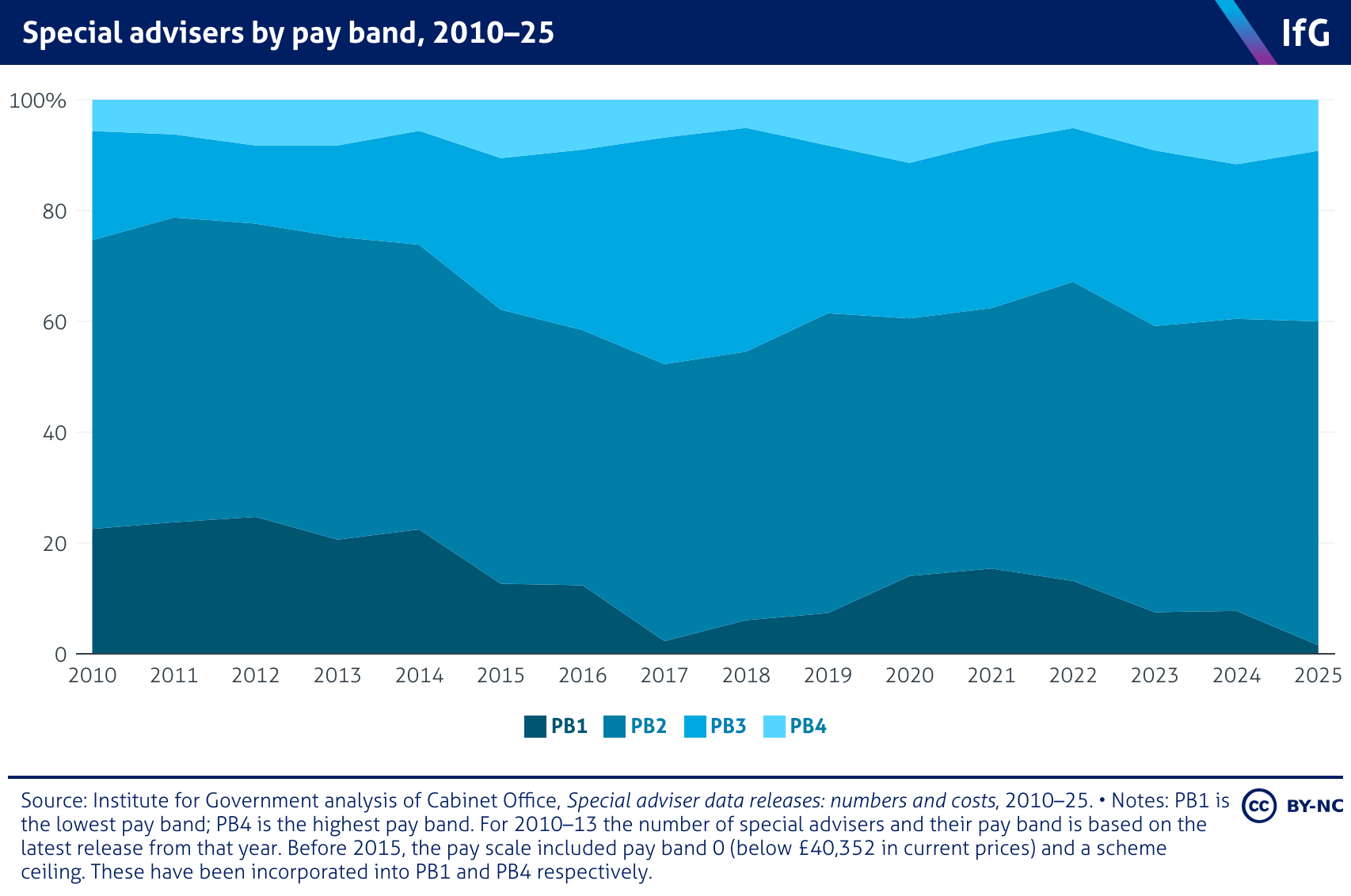 Institute for Government analysis of Cabinet Office, Special Adviser Data Release: Numbers and Costs, 2010–24 showing how an increasing number of special advisers have been employed at higher pay bands over time.