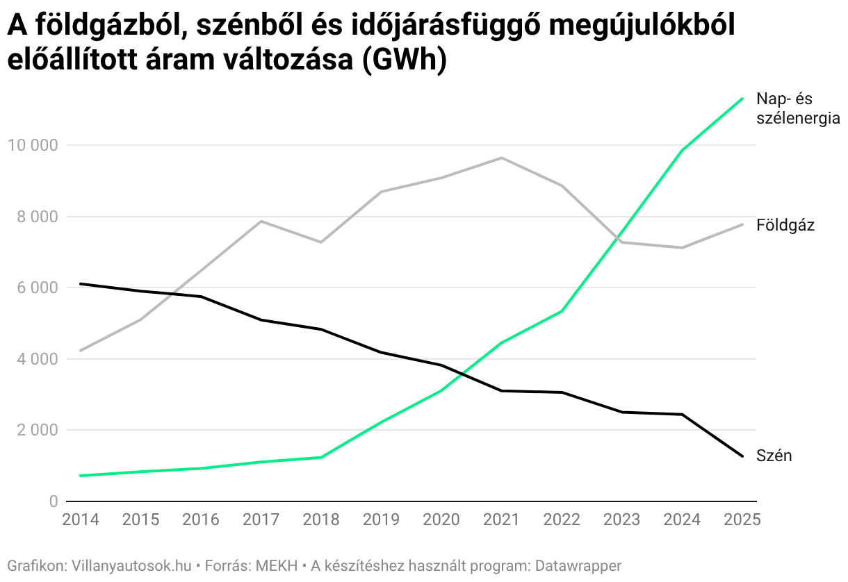 A földgázból, szénből és időjárásfüggő megújulókból előállított áram változása (GWh)