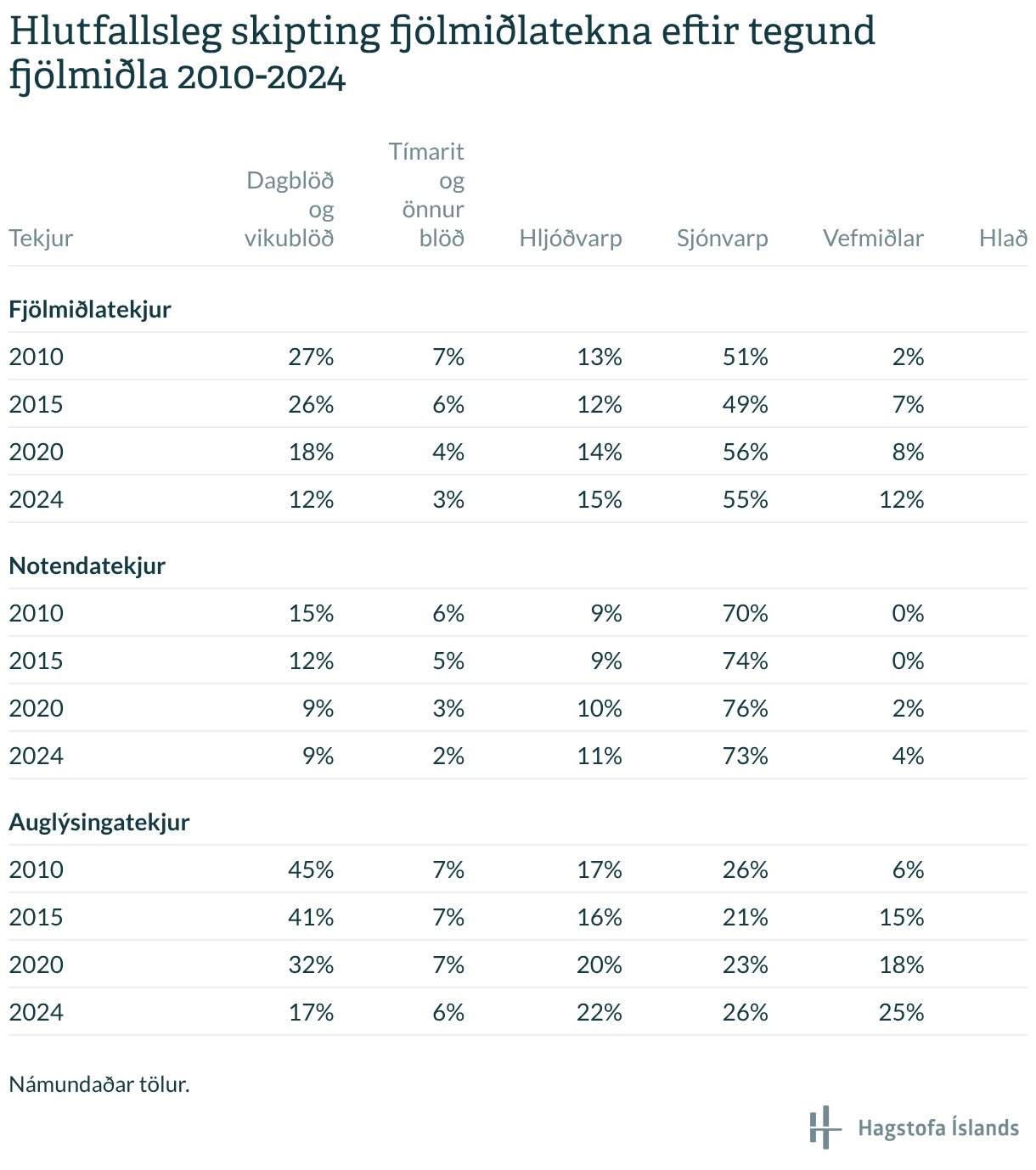 Hlutfallsleg skipting fjölmiðlatekna eftir tegund fjölmiðla 2010-2024