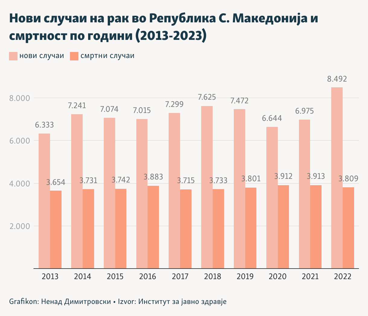 Нови случаи на рак во Република С. Македонија и смртност по години (2013-2023)