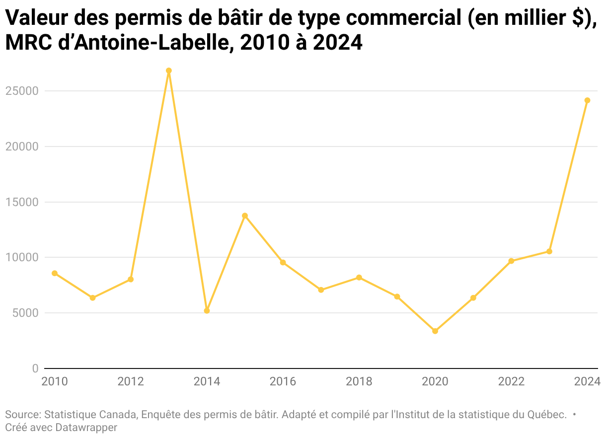 Valeur des permis de bâtir de type commercial (en millier $), MRC d’Antoine-Labelle, 2010 à 2024