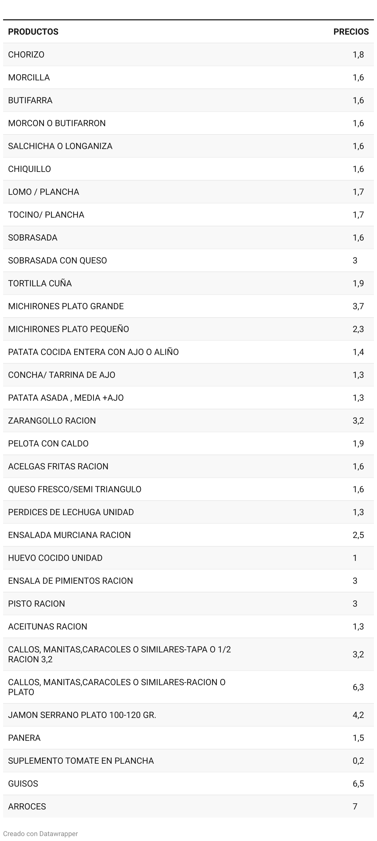 Precios tapas, guisos y arroces de las barracas 2025
