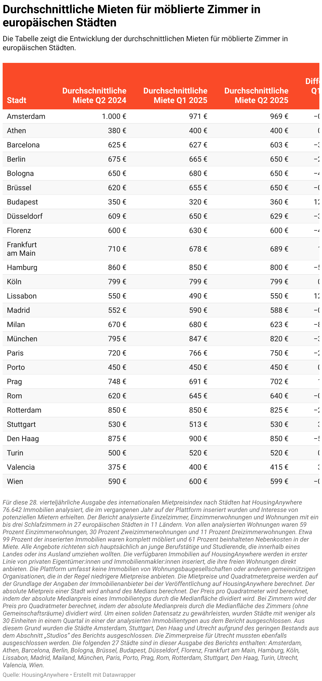 Die Tabelle zeigt die Entwicklung der durchschnittlichen Mieten für möblierte Zimmer in europäischen Städten.