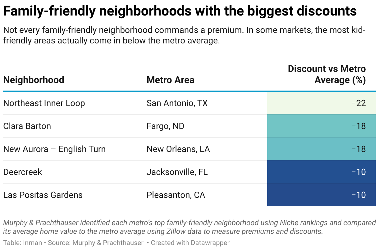 Not every family-friendly neighborhood commands a premium. In some markets, the most kid-friendly areas actually come in below the metro average.
