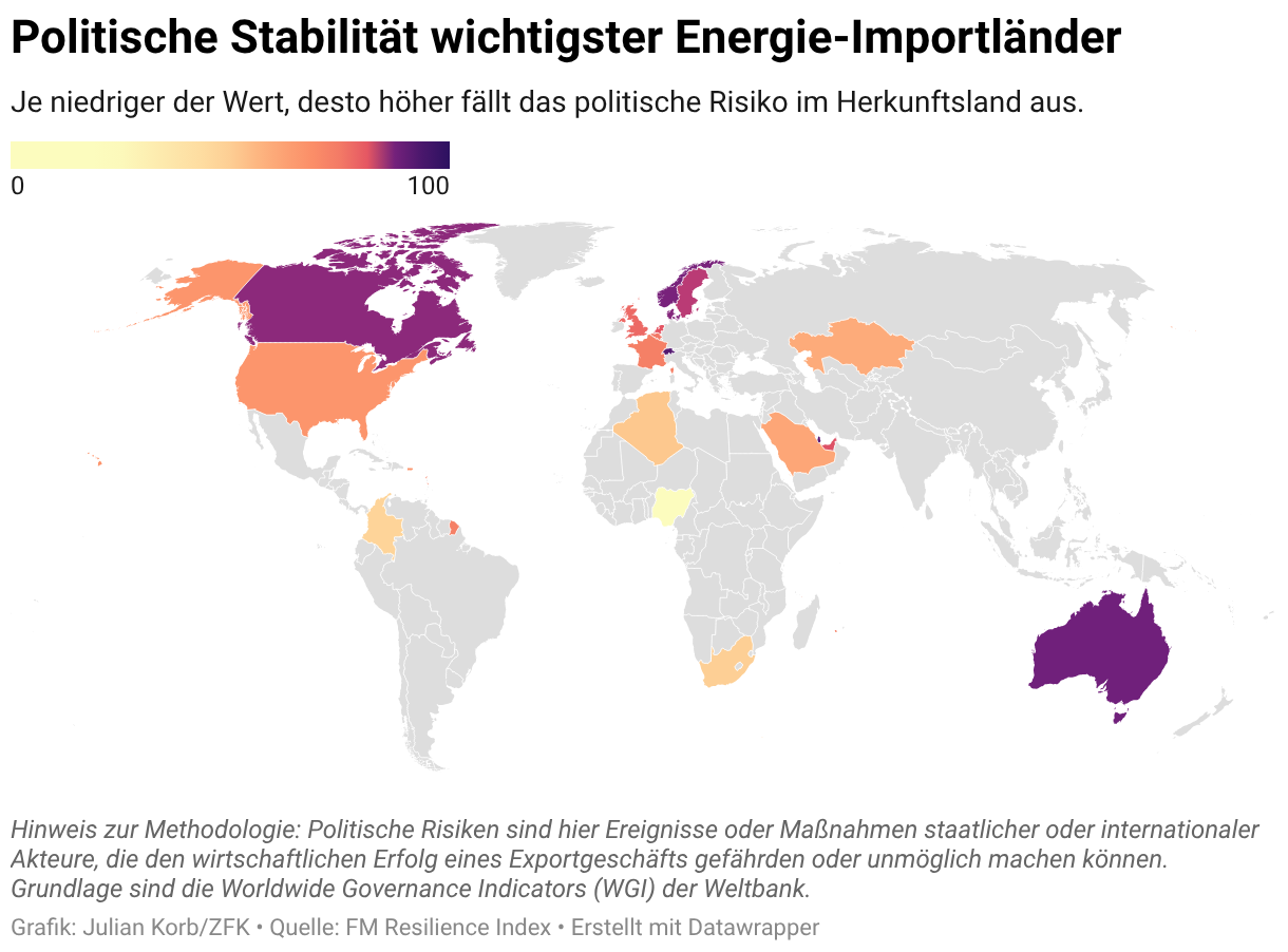 Je niedriger der Wert, desto höher fällt das politische Risiko im Herkunftsland aus.