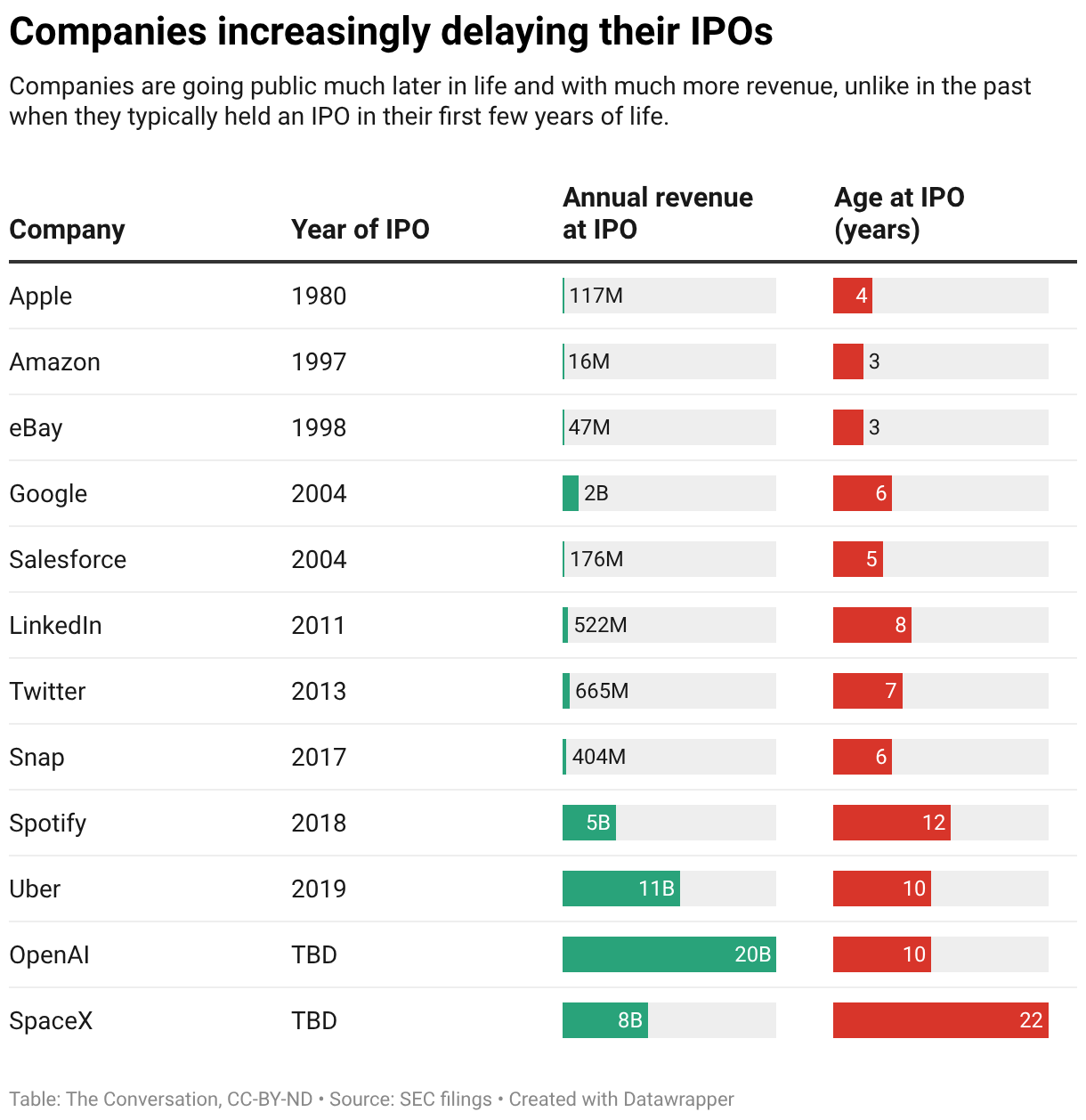 Companies are going public much later in life and with much more revenue, unlike in the past when they typically held an IPO in their first few years of life.