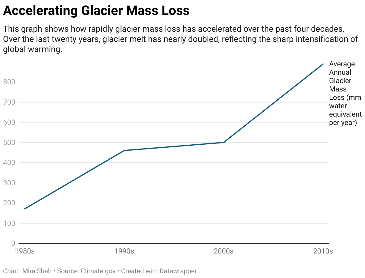 This graph shows how rapidly glacier mass loss has accelerated over the past four decades. Over the last twenty years, glacier melt has nearly doubled, reflecting the sharp intensification of global warming.