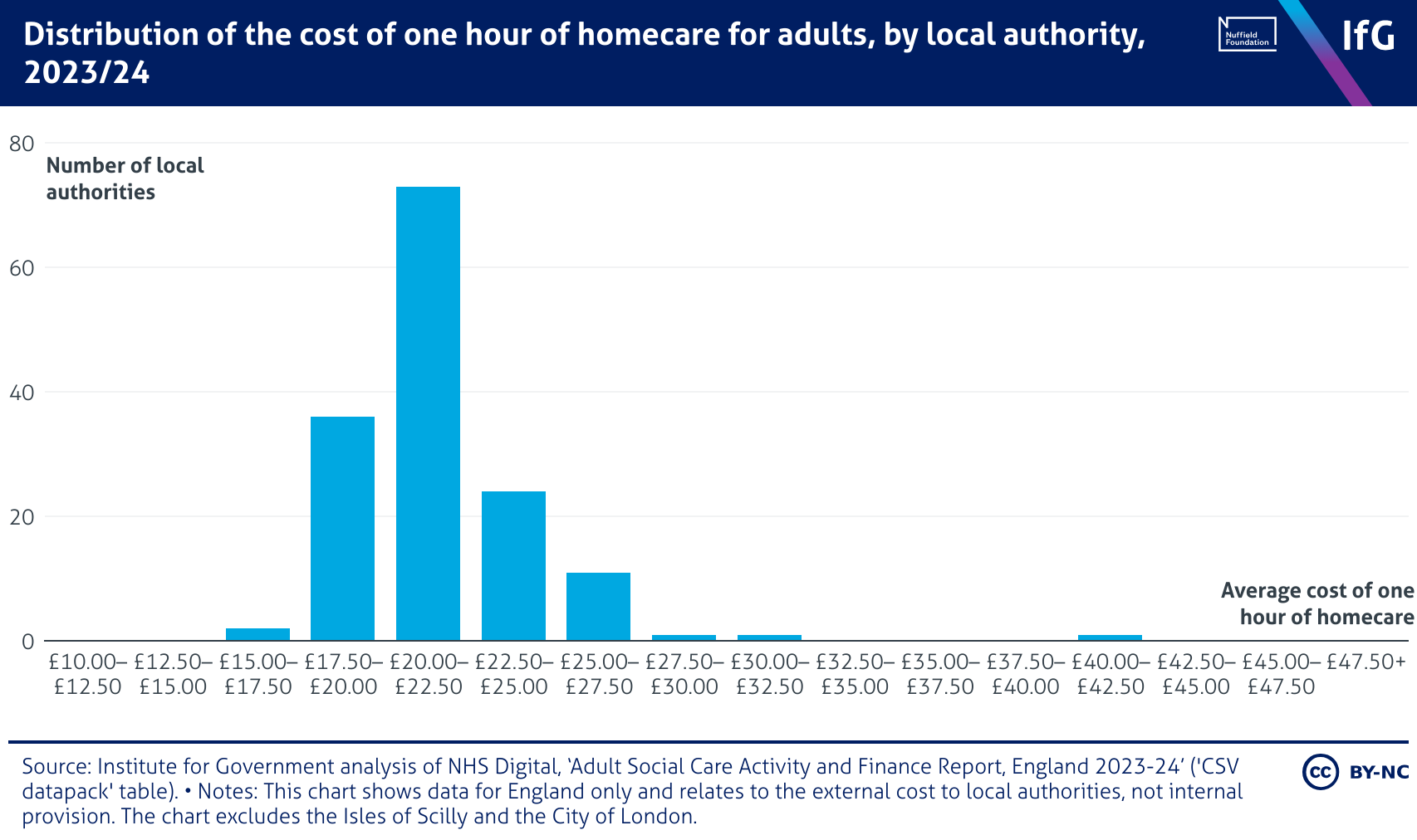 Distribution of the cost of one hour of homecare for adults, by local authority, 2023/24