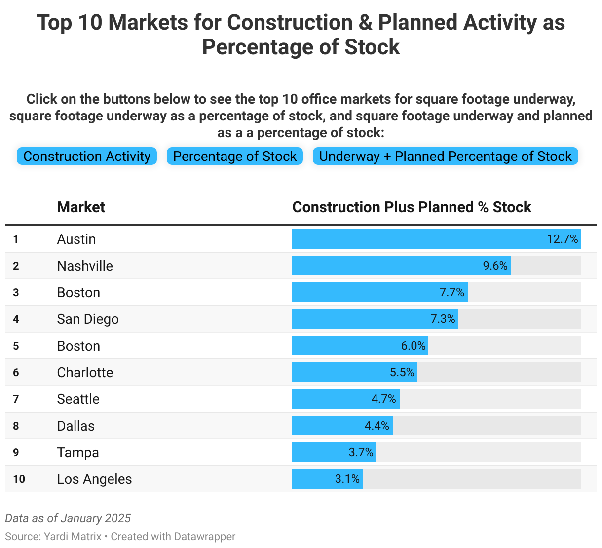 Click on the buttons below to see the top 10 office markets for square footage underway, square footage underway as a percentage of stock, and square footage underway and planned as a a percentage of stock: