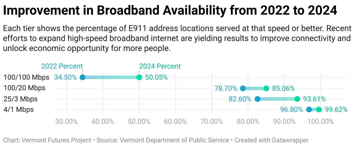 Each tier shows the percentage of E911 address locations served at that speed or better. Recent efforts to expand high-speed broadband internet are yielding results to improve connectivity and unlock economic opportunity for more people.
