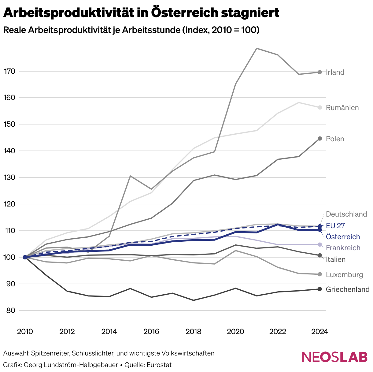 Reale Arbeitsproduktivität je Arbeitsstunde (Index, 2010 = 100)