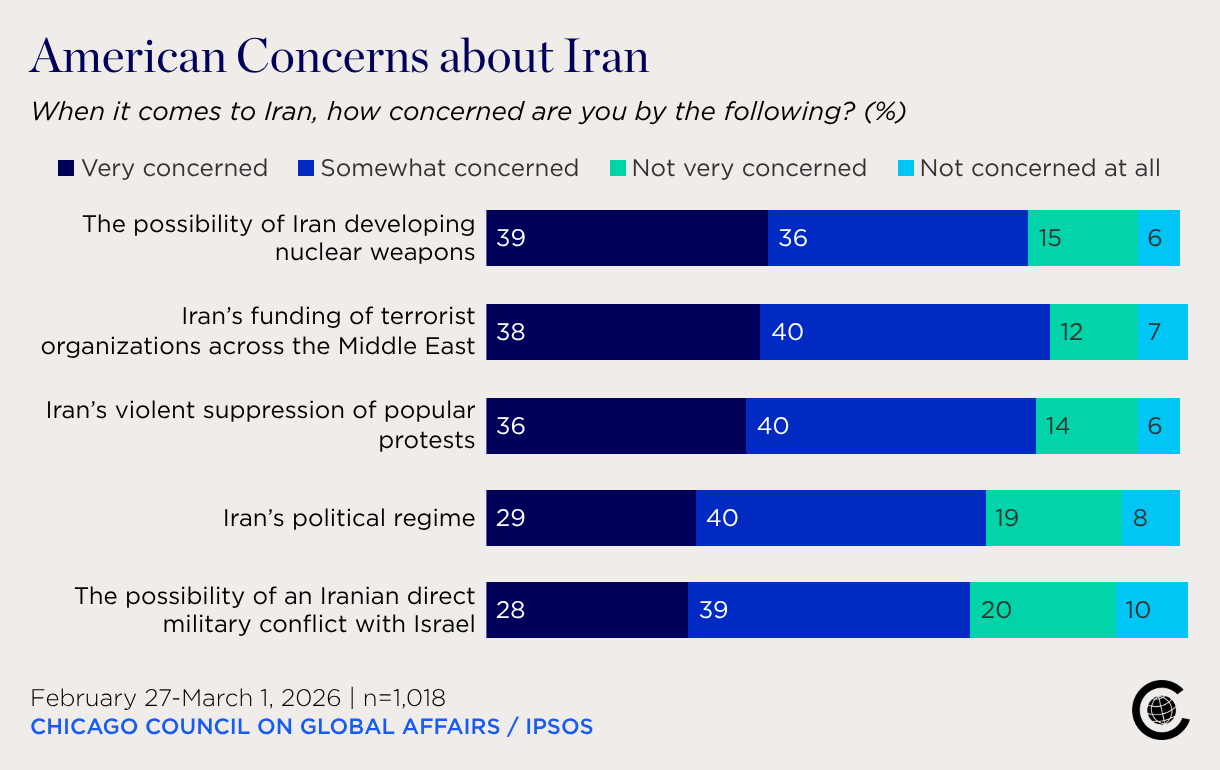 When it comes to Iran, how concerned are you by the following? (%)