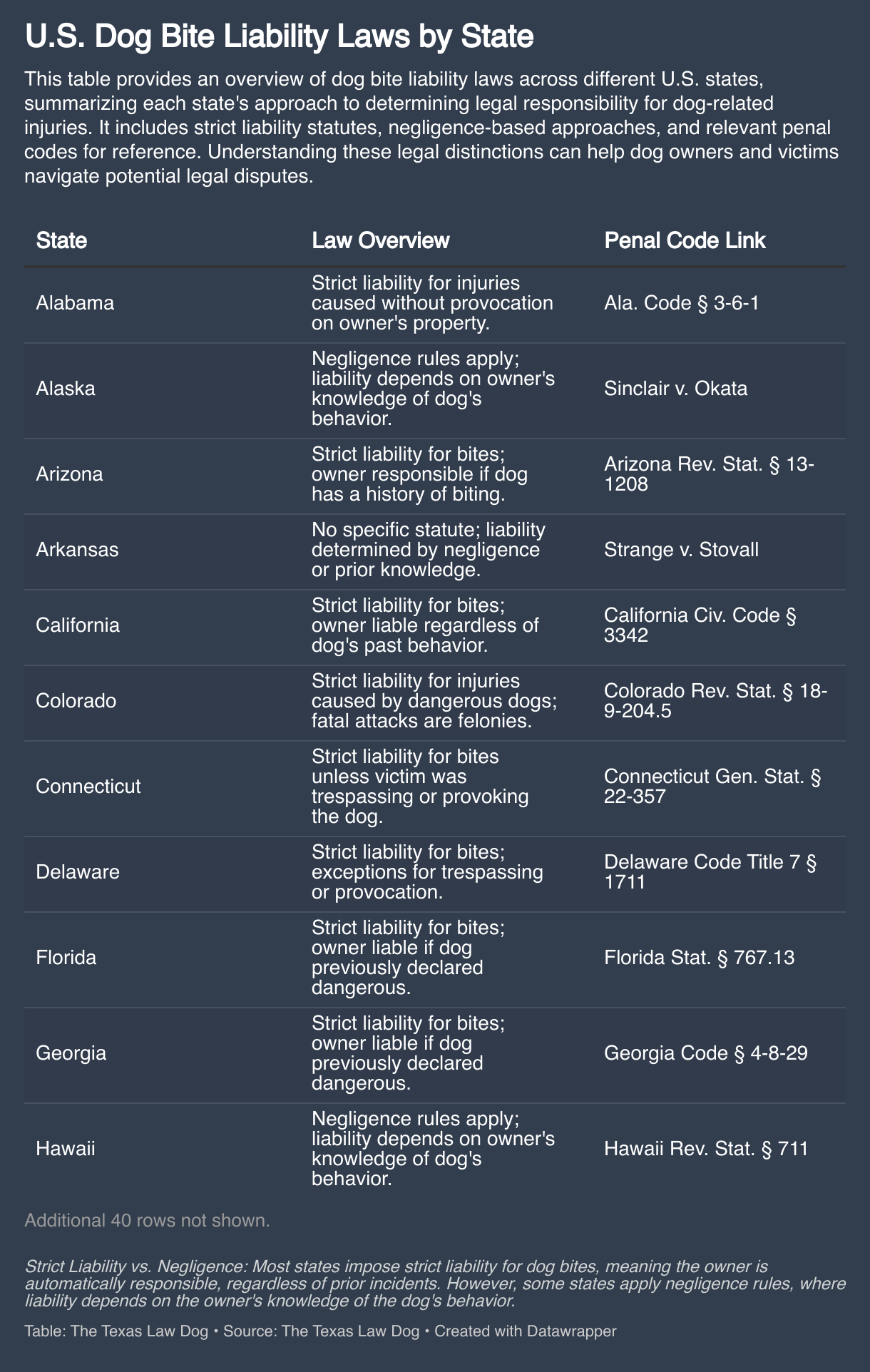 This table provides an overview of dog bite liability laws across different U.S. states, summarizing each state's approach to determining legal responsibility for dog-related injuries. It includes strict liability statutes, negligence-based approaches, and relevant penal codes for reference. Understanding these legal distinctions can help dog owners and victims navigate potential legal disputes.