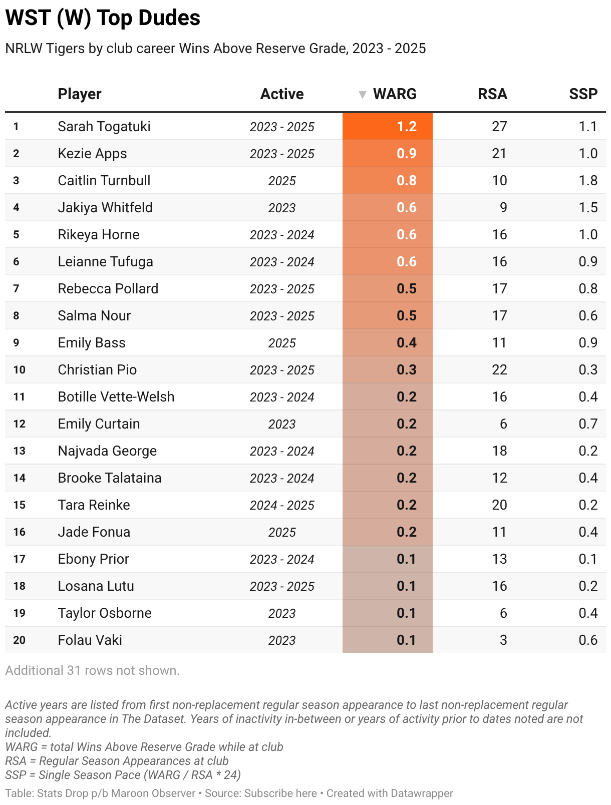 NRLW Tigers by club career Wins Above Reserve Grade, 2023 - 2025