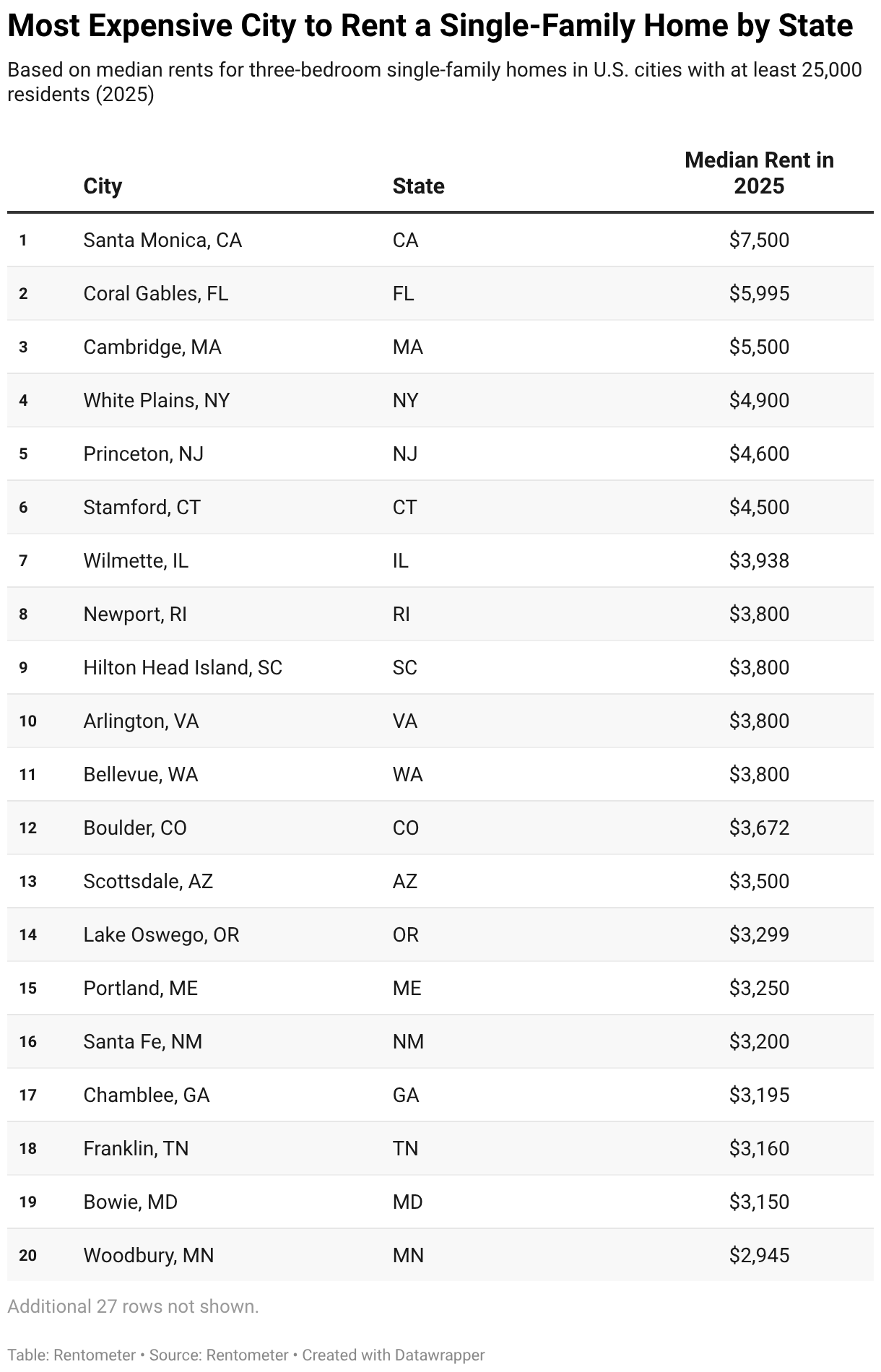 Based on median rents for three-bedroom single-family homes in U.S. cities with at least 25,000 residents (2025)