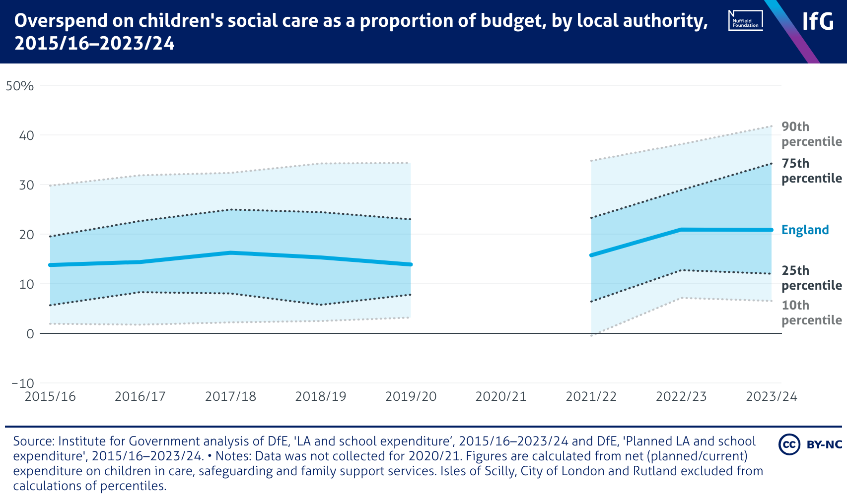 A line chart from the Institute for Government showing overspend on children's social care as a proportion of budget, by local authority, 2015/16–2023/24, where on average in England, overspend has risen from 14% to around 21% over the time period, with the 90th percentile overspending 42% and the 10th percentile at 6.5%.
