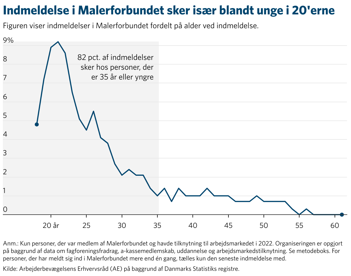 Figuren viser indmeldelser i Malerforbundet fordelt på alder ved indmeldelse.