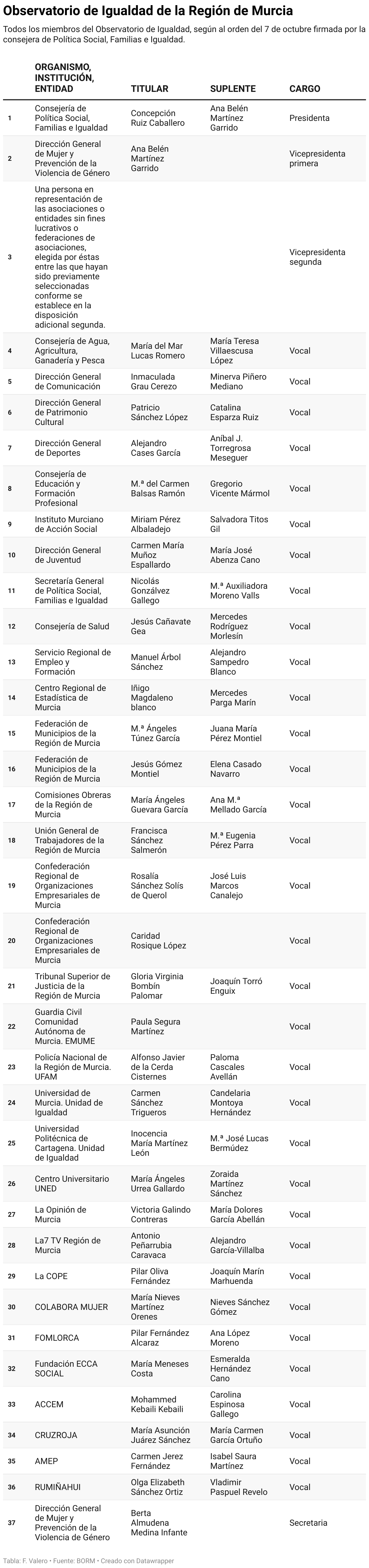Todos los miembros del Observatorio de Igualdad, según al orden del 7 de octubre firmada por la consejera de Política Social, Familias e Igualdad.
