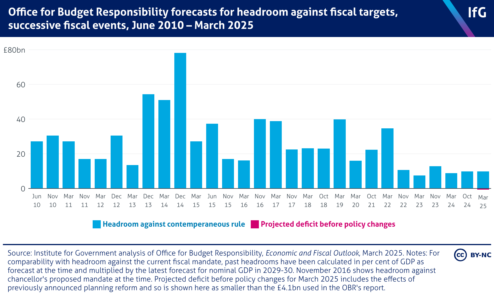 Office for Budget Responsibility forecasts for headroom against fiscal targets, successive fiscal events, June 2010 – March 2025