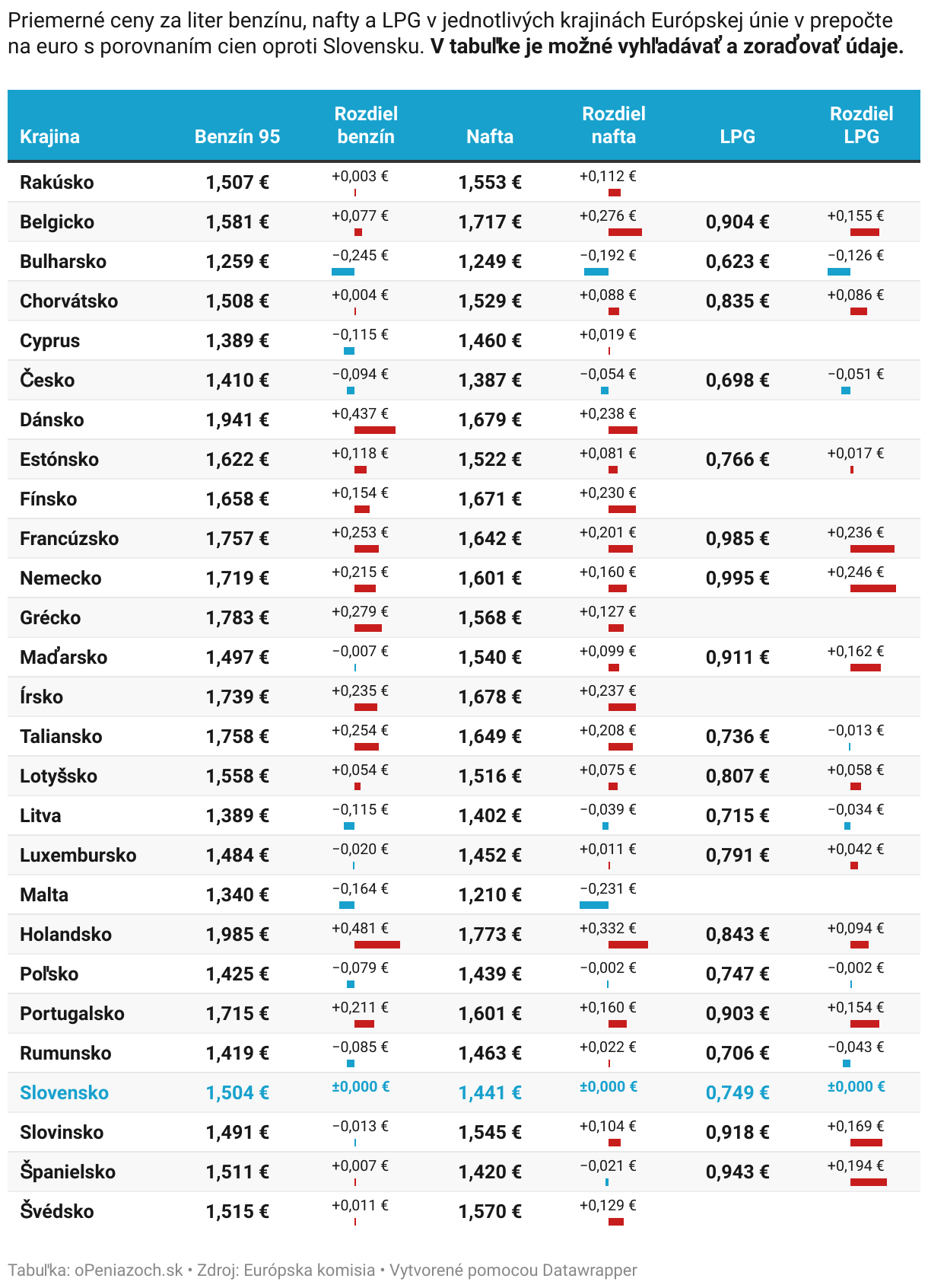 Priemerné ceny za liter benzínu, nafty a LPG v jednotlivých krajinách Európskej únie v prepočte na euro s porovnaním cien oproti Slovensku. V tabuľke je možné vyhľadávať a zoraďovať údaje.