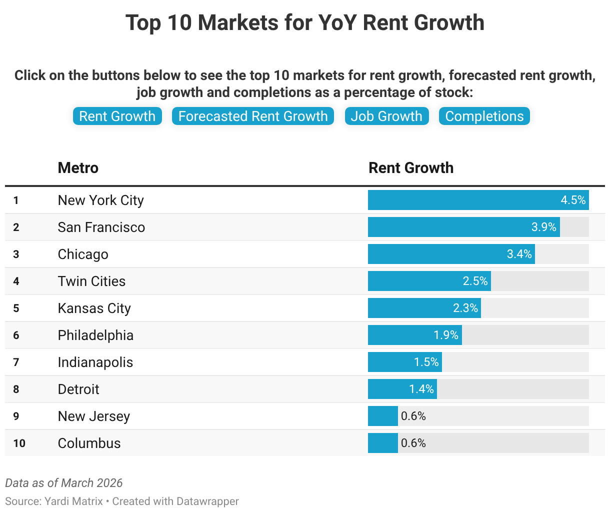 Click on the buttons below to see the top 10 markets for rent growth, forecasted rent growth, job growth and completions as a percentage of stock: