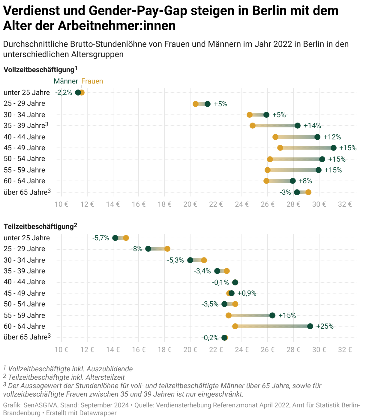 Bei Vollzeitbeschäftigten erhalten die Berliner Männer über nahezu alle Altersgruppen zwischen 5 Prozent und 15 Prozent höhere Brutto-Stundenlöhne als die Berlinerinnen. Lediglich bei den unter 25-Jährigen ( 2,8 Prozent) sowie den über 65-Jährigen ( 3 Prozent) verdienen die Männer weniger.