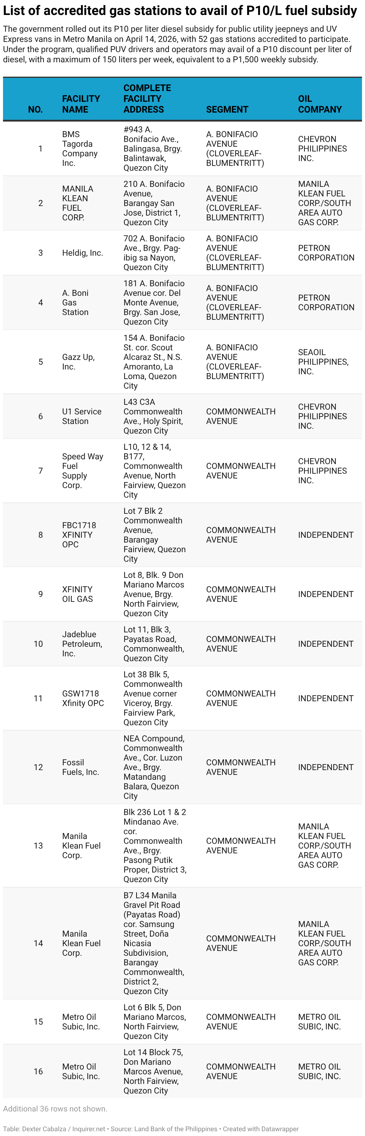 The government rolled out its P10 per liter diesel subsidy for public utility jeepneys and UV Express vans in Metro Manila on April 14, 2026, with 52 gas stations accredited to participate. Under the program, qualified PUV drivers and operators may avail of a P10 discount per liter of diesel, with a maximum of 150 liters per week, equivalent to a P1,500 weekly subsidy.