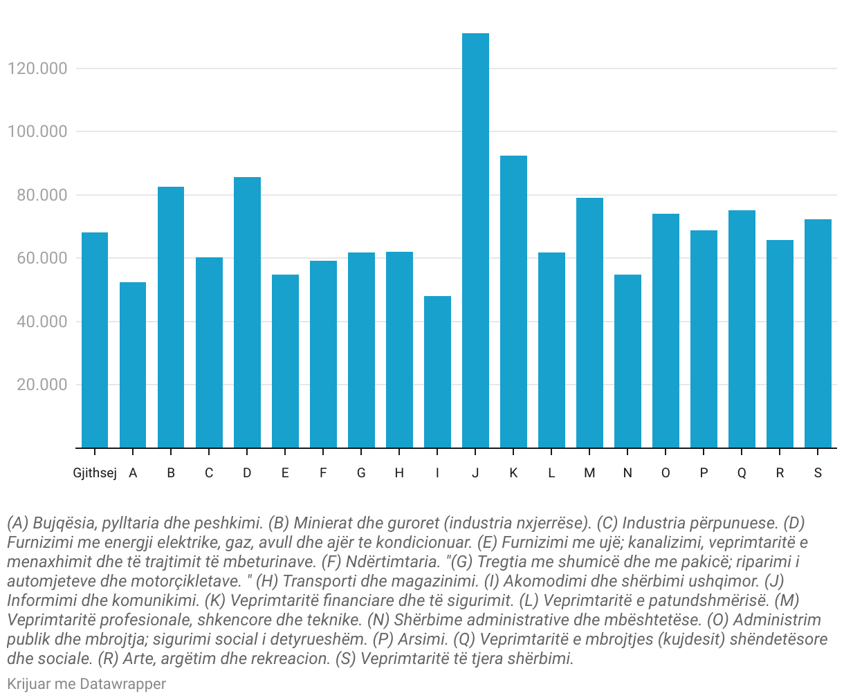 (A) Bujqësia, pylltaria dhe peshkimi. (B) Minierat dhe guroret (industria nxjerrëse). (C) Industria përpunuese. (D) Furnizimi me energji elektrike, gaz, avull dhe ajër te kondicionuar. (E) Furnizimi me ujë; kanalizimi, veprimtaritë e menaxhimit dhe të trajtimit të mbeturinave. (F) Ndërtimtaria. "(G) Tregtia me shumicë dhe me pakicë; riparimi i automjeteve dhe motorçikletave. " (H) Transporti dhe magazinimi. (I) Akomodimi dhe shërbimi ushqimor. (J) Informimi dhe komunikimi. (K) Veprimtaritë financiare dhe të sigurimit. (L) Veprimtaritë e patundshmërisë. (M) Veprimtaritë profesionale, shkencore dhe teknike. (N) Shërbime administrative dhe mbështetëse. (O) Administrim publik dhe mbrojtja; sigurimi social i detyrueshëm. (P) Arsimi. (Q) Veprimtaritë e mbrojtjes (kujdesit) shëndetësore dhe sociale. (R) Arte, argëtim dhe rekreacion. (S) Veprimtaritë të tjera shërbimi.