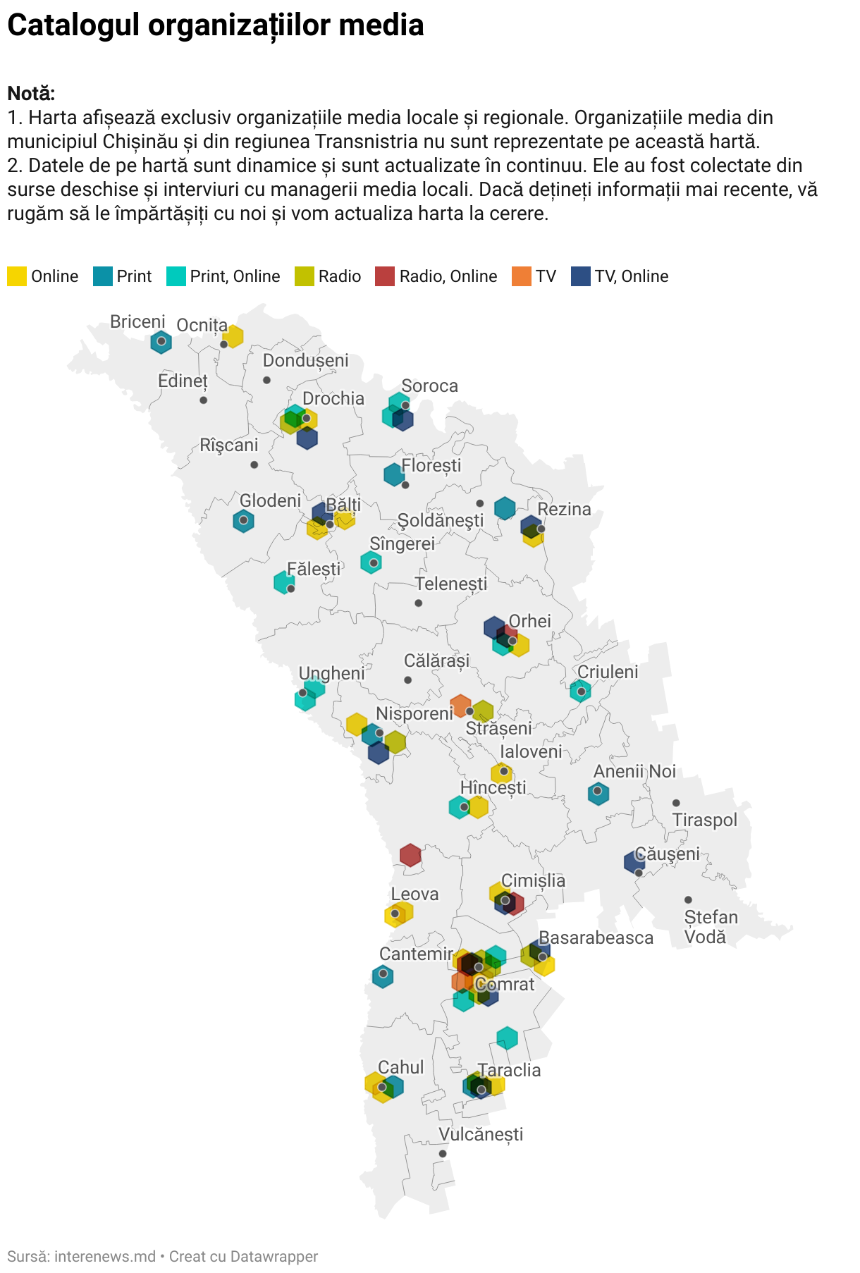 1. Harta afișează exclusiv organizațiile media locale și regionale. Organizațiile media din municipiul Chișinău și din regiunea Transnistria nu sunt reprezentate pe această hartă.