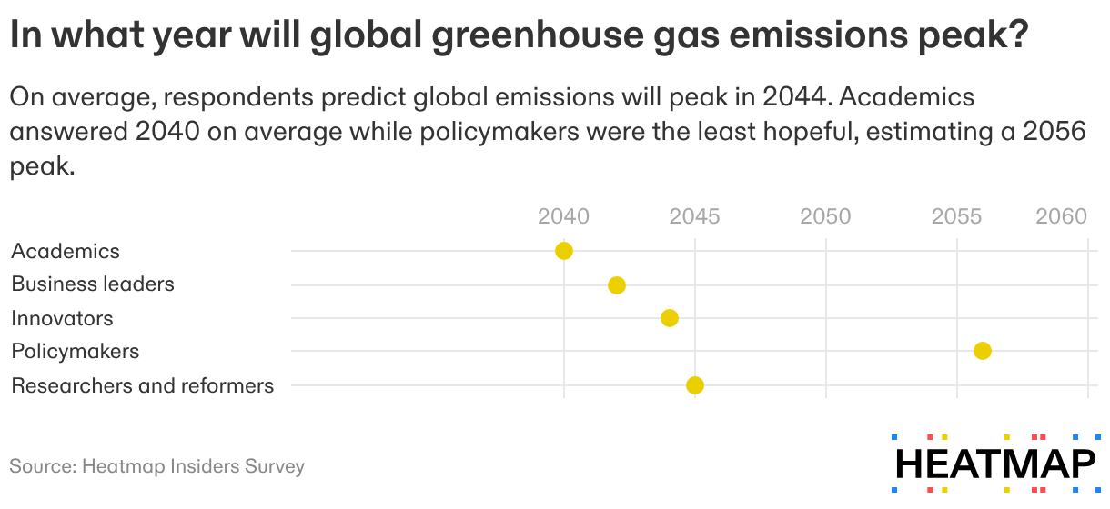 On average, respondents predict global emissions will peak in 2044. Academics answered 2040 on average while policymakers were the least hopeful, estimating a 2056 peak.