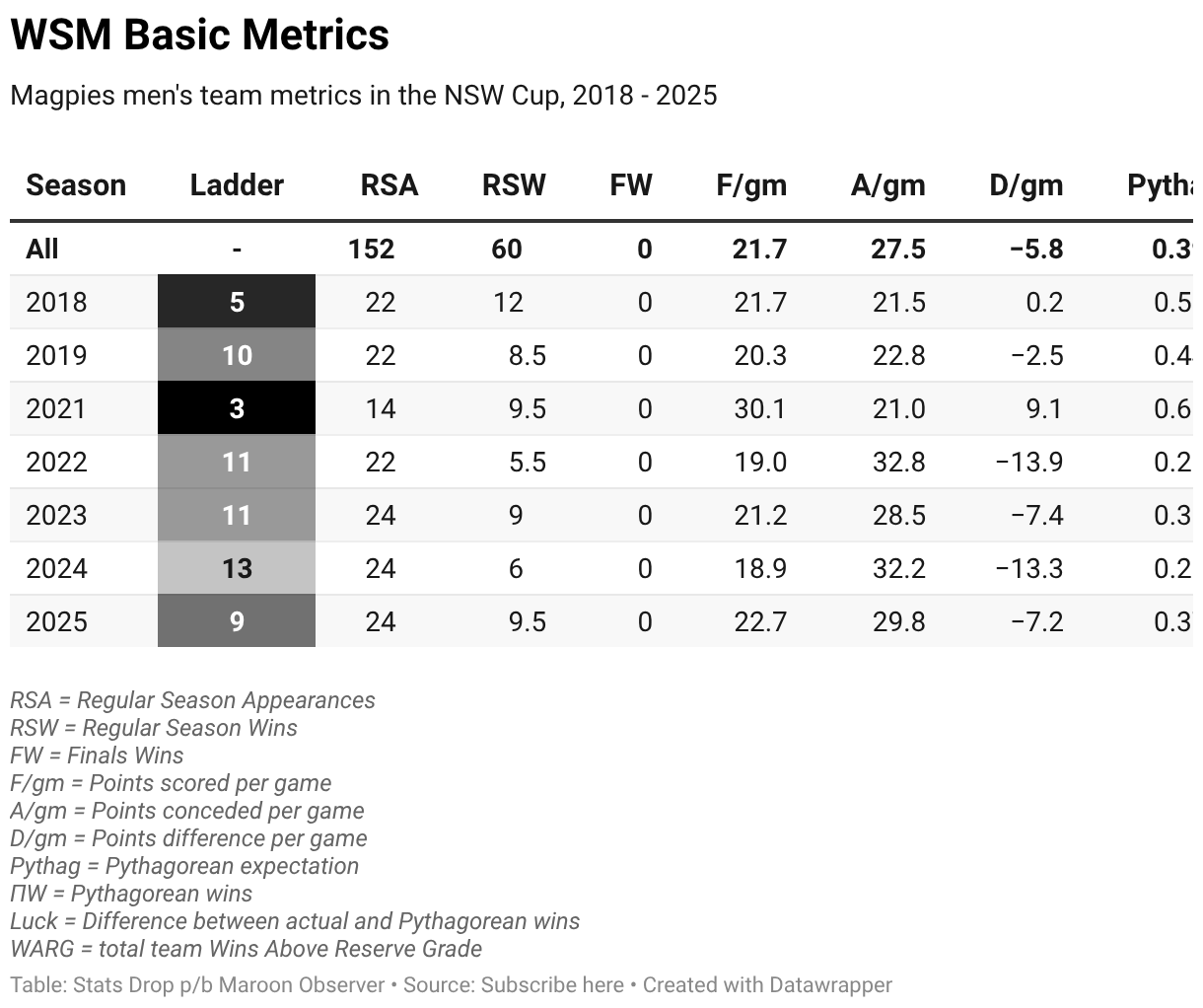Magpies men's team metrics in the NSW Cup, 2018 - 2025