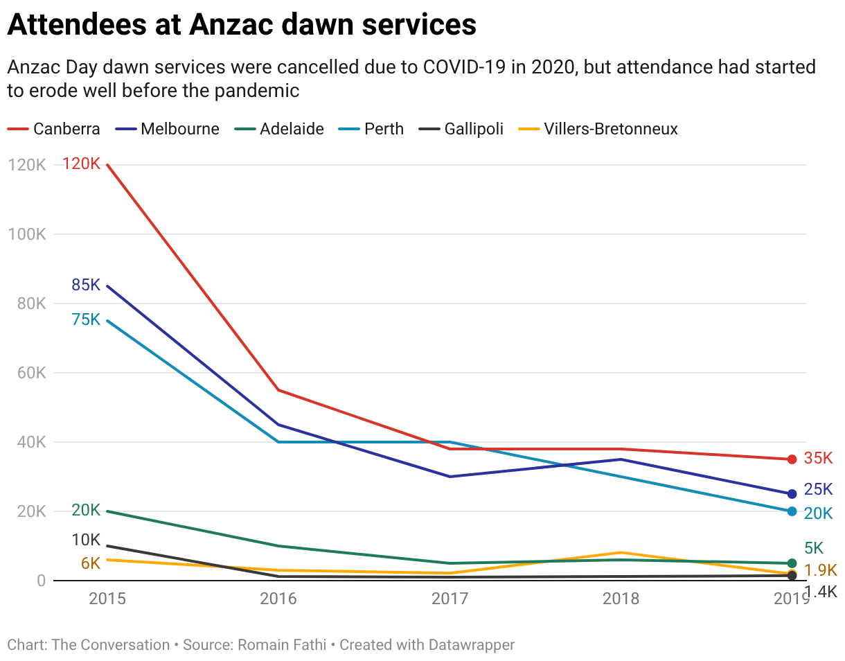 Anzac Day dawn services were cancelled due to COVID-19 in 2020, but attendance had started to erode well before the pandemic