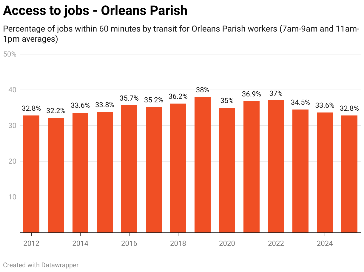 Percentage of jobs within 60 minutes by transit for Orleans Parish workers (7am-9am and 11am-1pm averages)