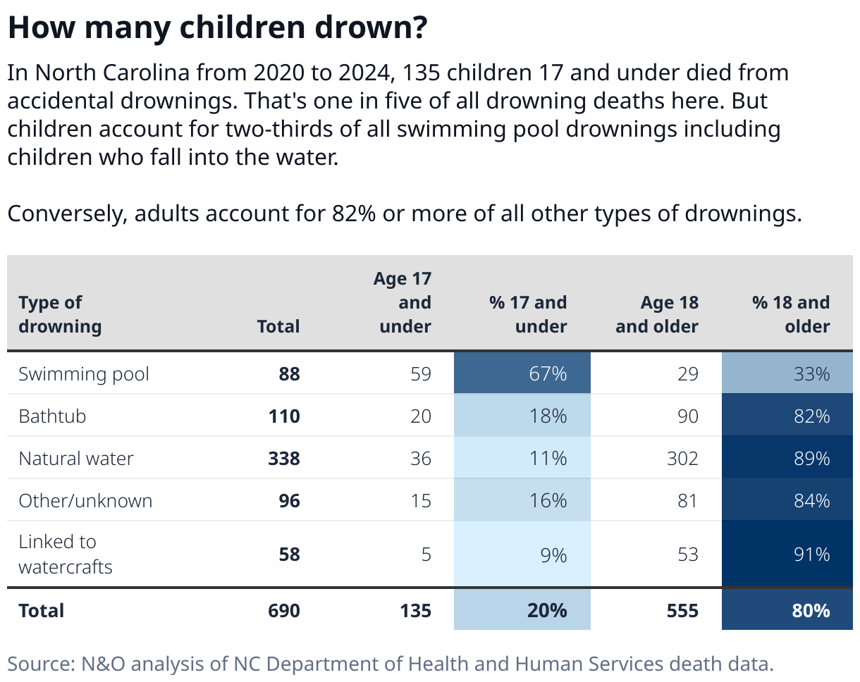 In North Carolina from 2020 to 2024, 135 children 17 and under died from accidental drownings. That's one in five of all drowning deaths here. But children account for two-thirds of all swimming pool drownings including children who fall into the water.