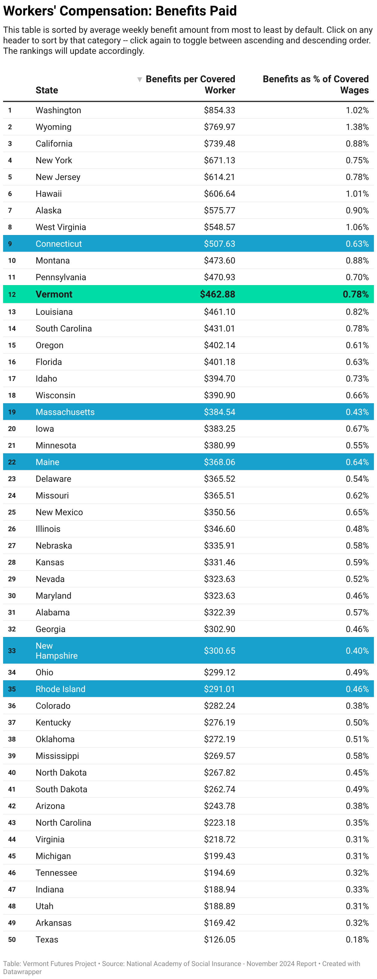 This table is sorted by average weekly benefit amount from most to least by default. Click on any header to sort by that category -- click again to toggle between ascending and descending order. The rankings will update accordingly.