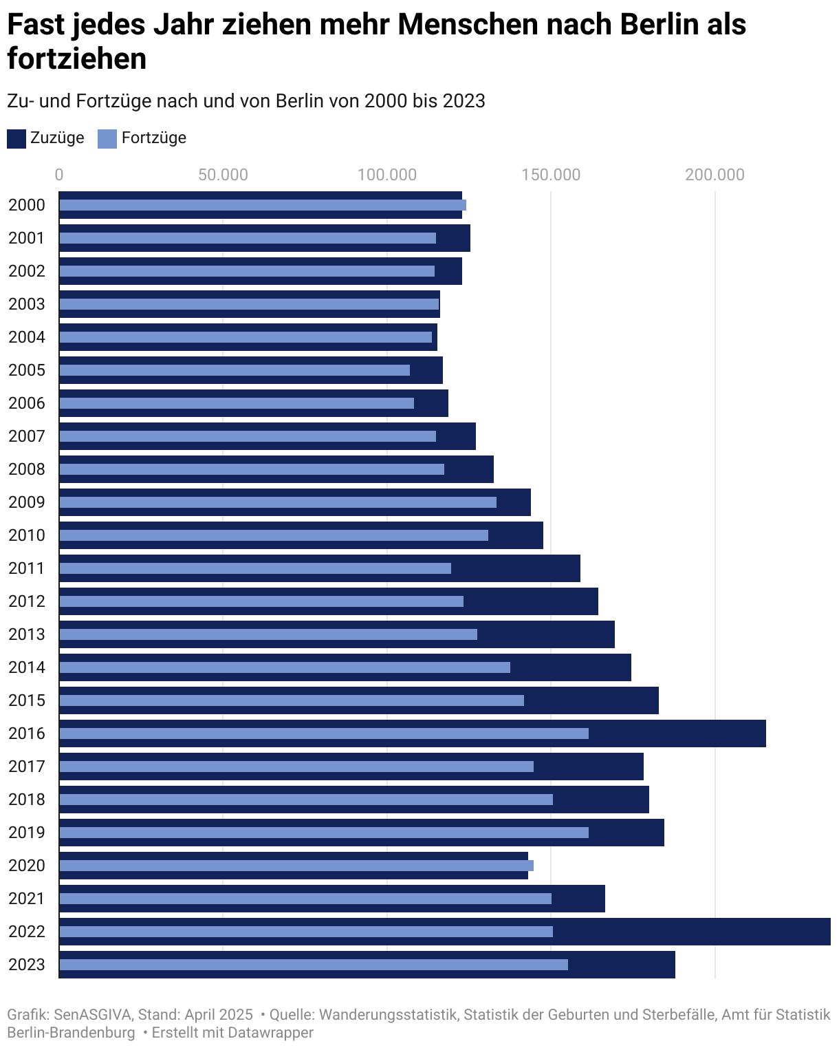 Bis auf die Jahre 2000 und 2020 zogen mehr Menschen nach Berlin als fortgezogen sind. Besonders deutlich war dies in den Jahren 2011 bis 2019 sowie im Jahr 2022.
