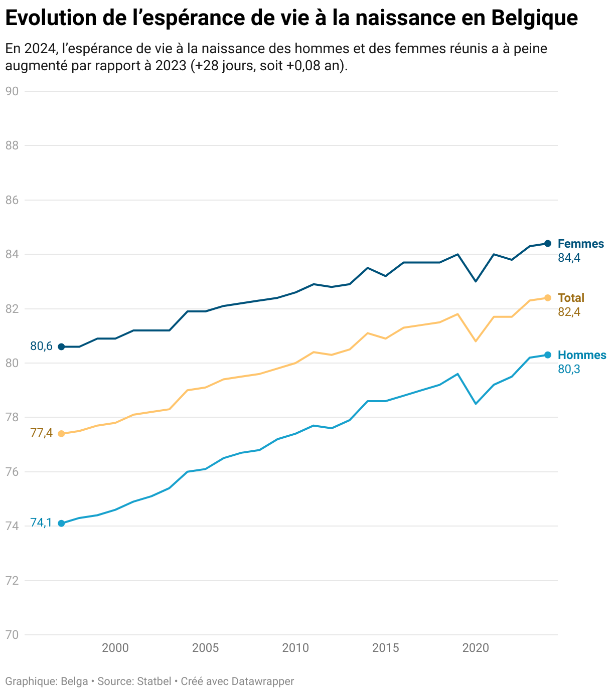 En 2024, l’espérance de vie à la naissance des hommes et des femmes réunis a à peine augmenté par rapport à 2023 (+28 jours, soit +0,08 an).