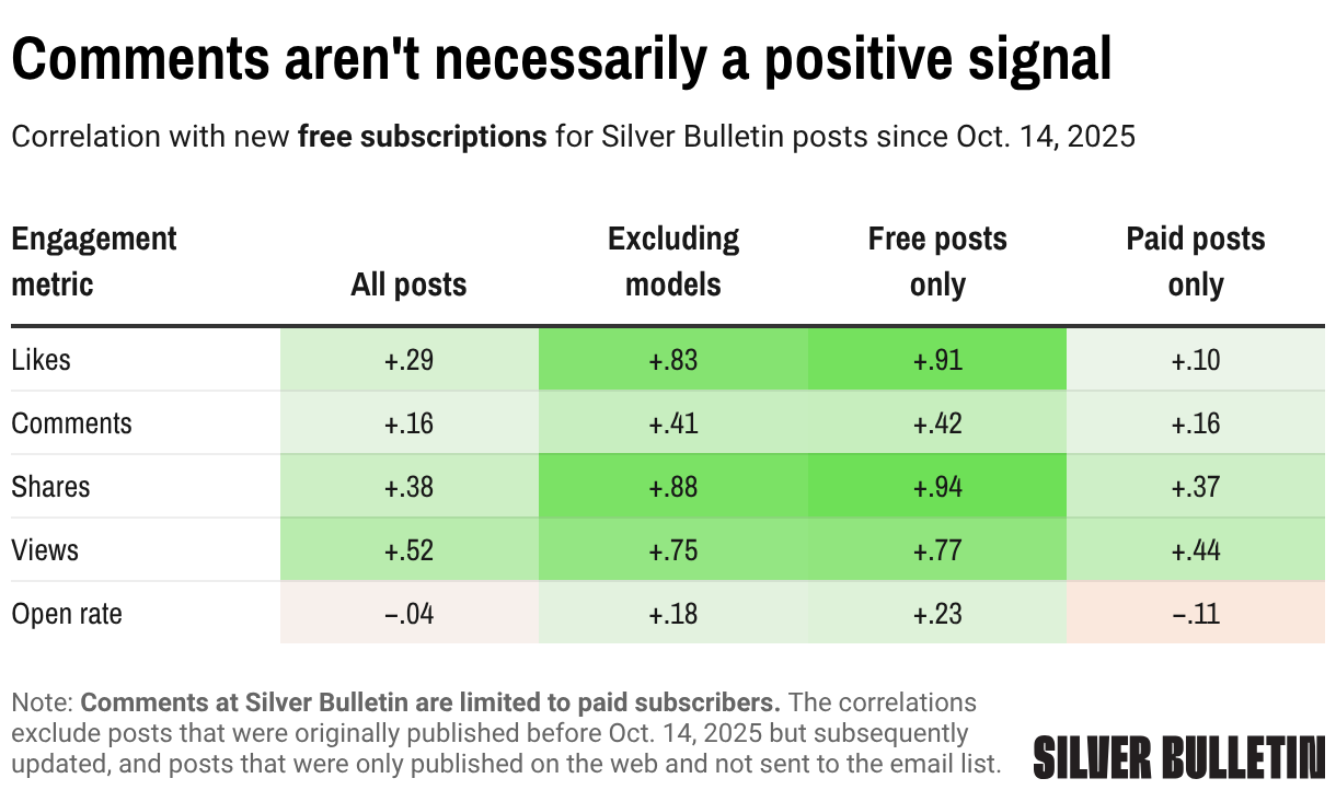 Correlation with new free subscriptions for Silver Bulletin posts since Oct. 14, 2025