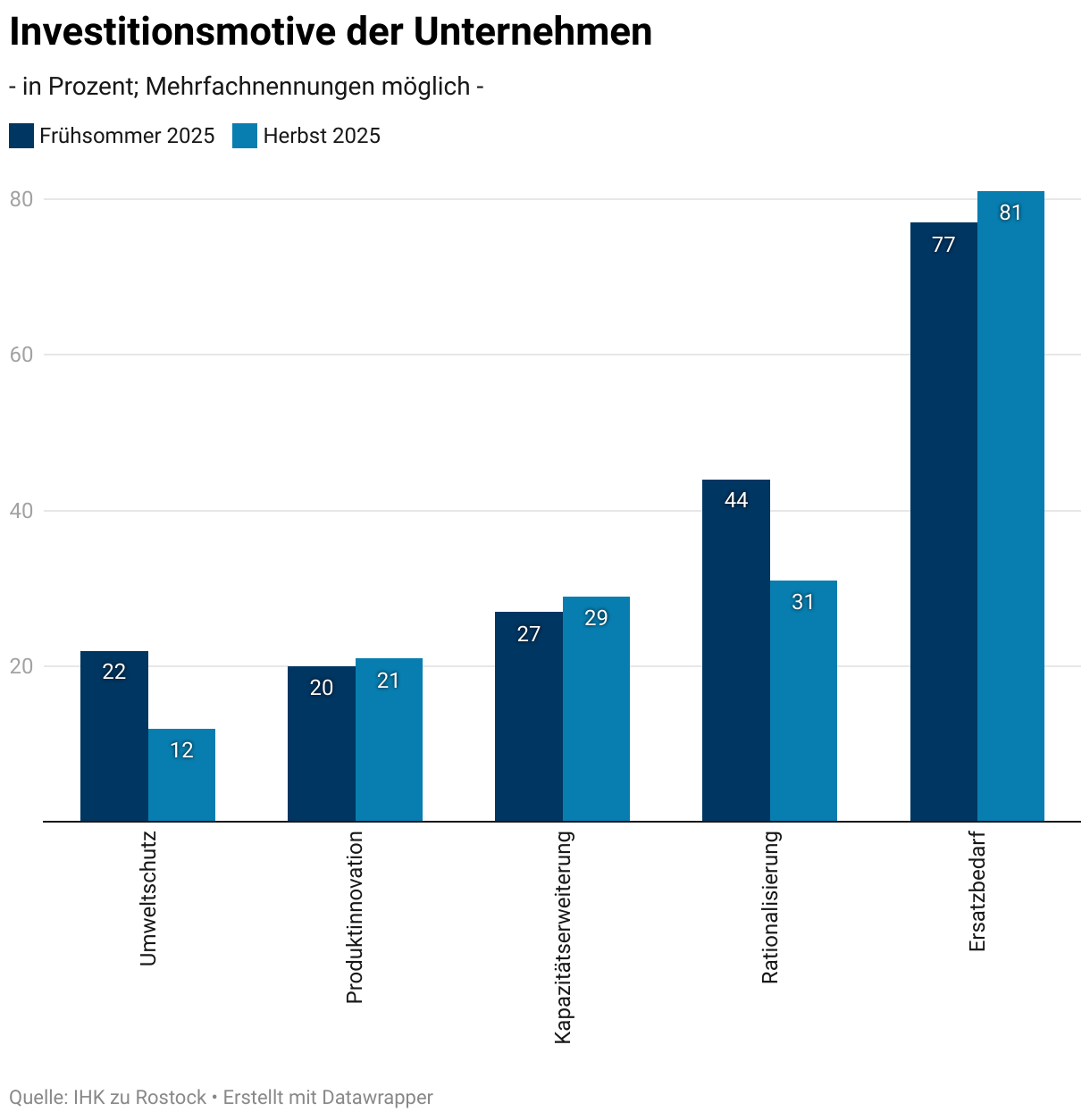 Das Balkendiagramm zeigt die Investitionsmotive im Frühsommer und Herbst 2025. Ersatzbedarf dominiert mit 77 % und steigt auf 81 %. Rationalisierung sinkt von 44 % auf 31 %. Umweltschutz nimmt deutlich ab. Produktinnovation und Kapazitätserweiterung steigen leicht.