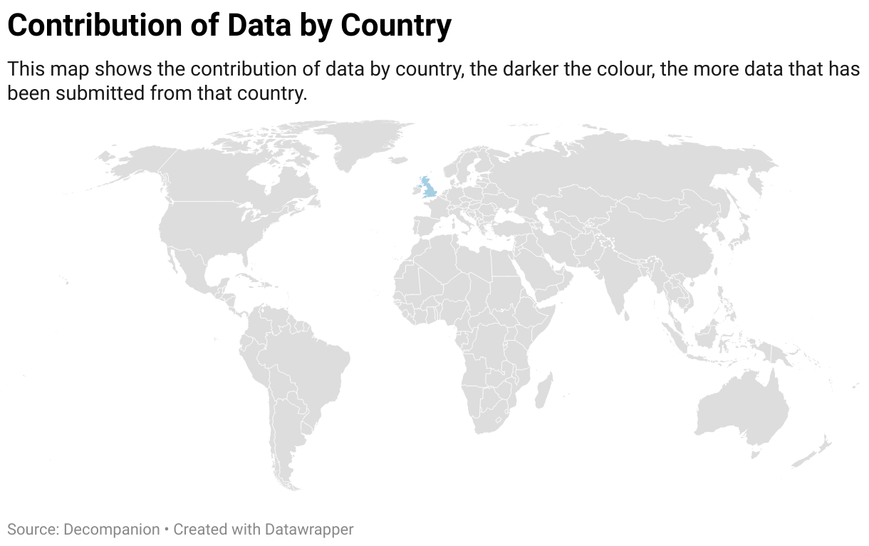 This map shows the contribution of data by country, the darker the colour, the more data that has been submitted from that country.