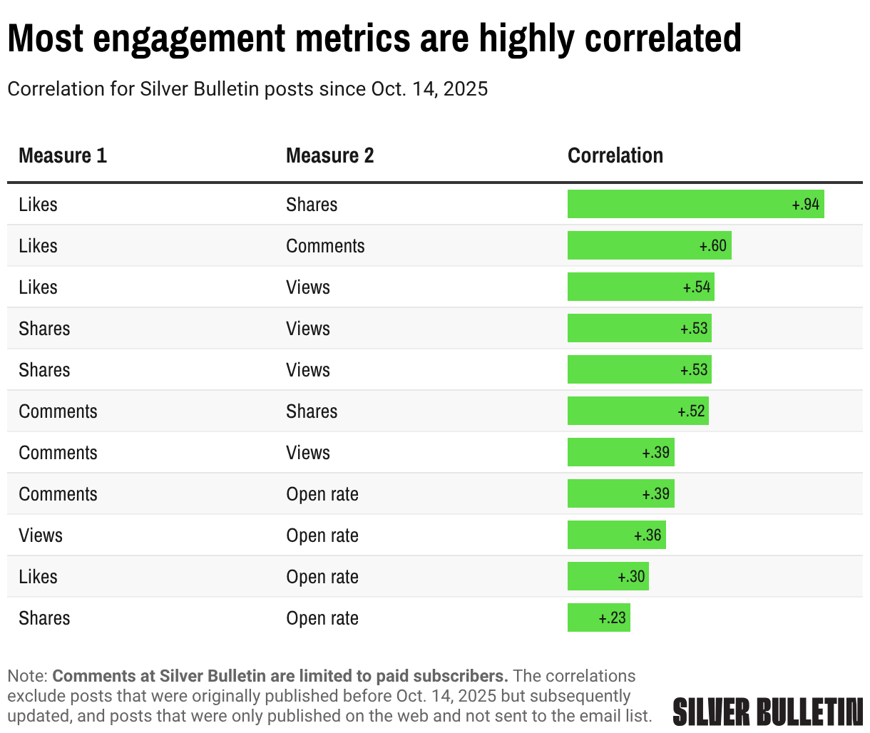 Correlation for Silver Bulletin posts since Oct. 14, 2025