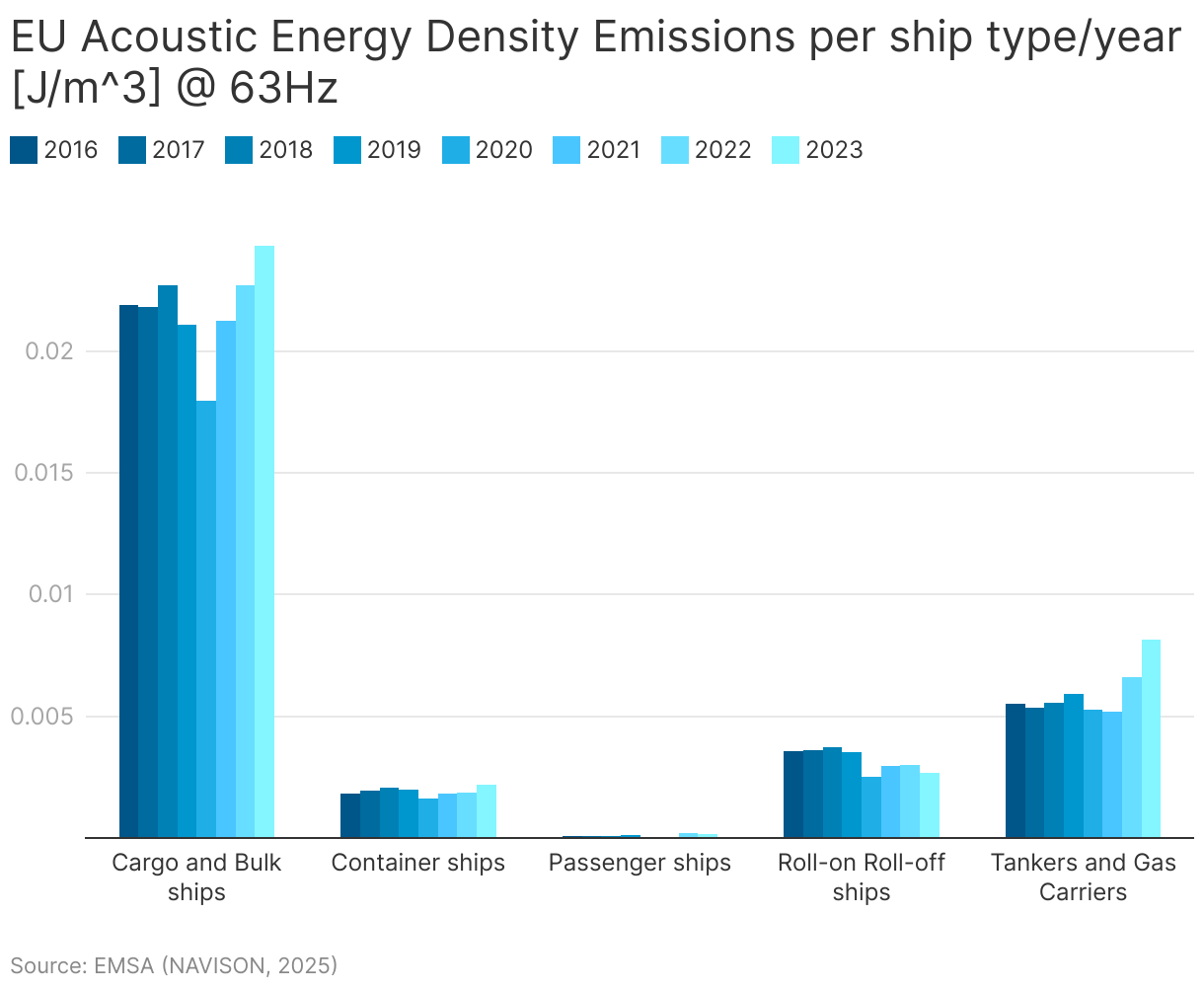 EU Acoustic Energy Density Emissions per ship type/year [J/m^3] @ 63Hz