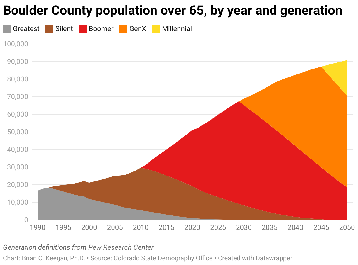 Boulder County population over 65, by year and generation
