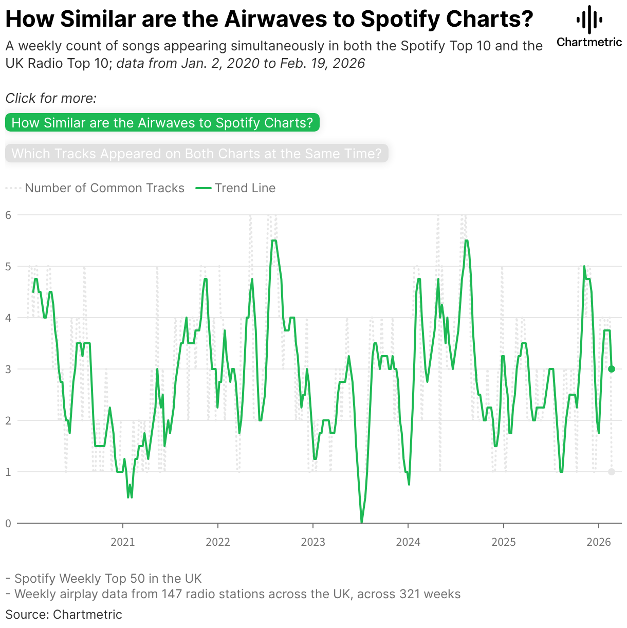 A weekly count of songs appearing simultaneously in both the Spotify Top 10 and the UK Radio Top 10; data from Jan. 2, 2020 to Feb. 19, 2026