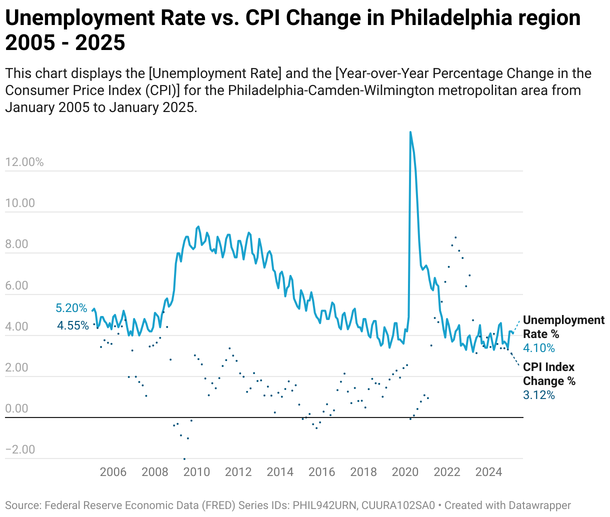 This chart displays the [Unemployment Rate] and the [Year-over-Year Percentage Change in the Consumer Price Index (CPI)] for the Philadelphia-Camden-Wilmington metropolitan area from January 2005 to January 2025.