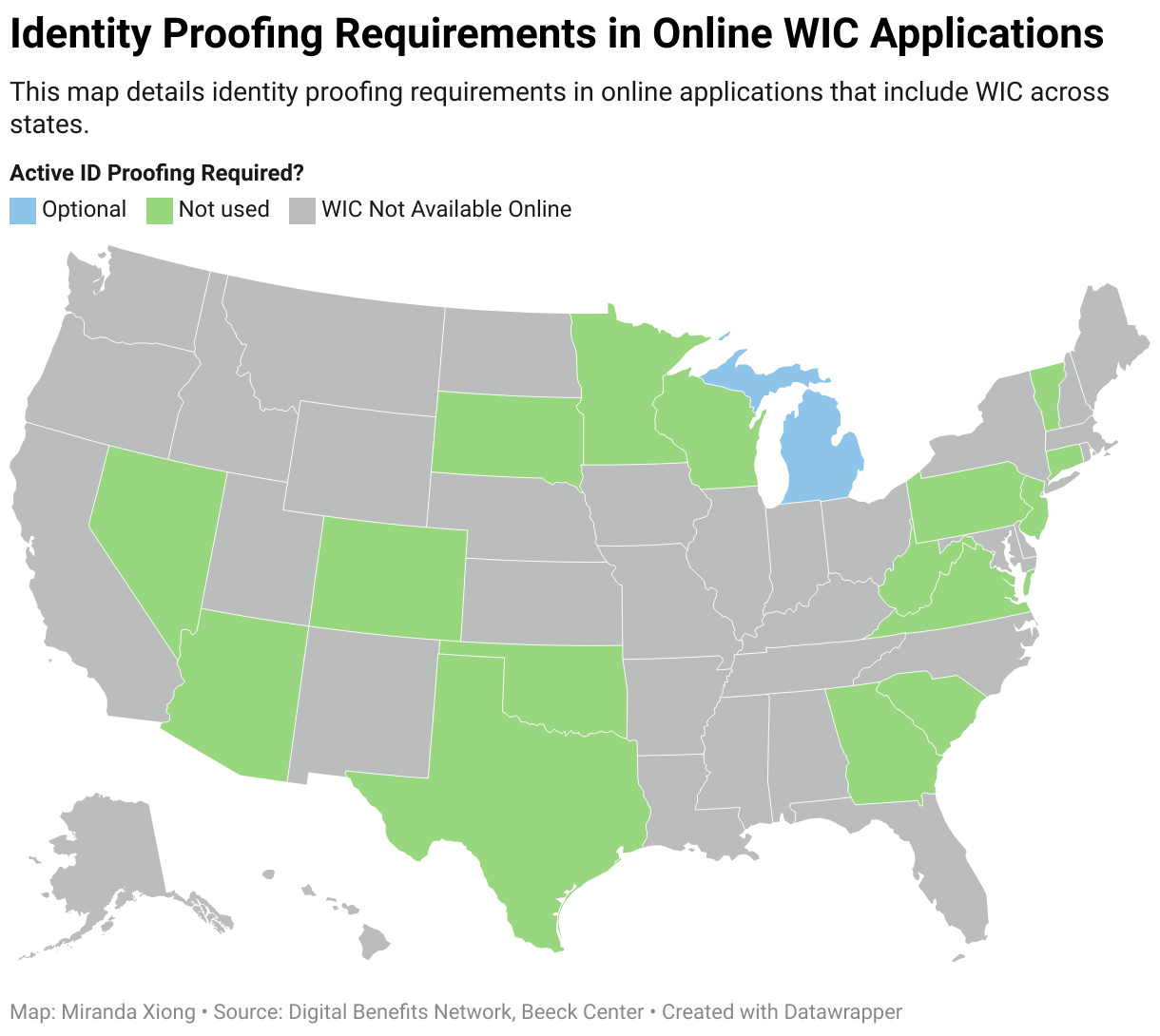 This image shows a map of the continental United States and depicts which states use optional identity proofing, and which states do not require identity proofing for their online WIC applications.