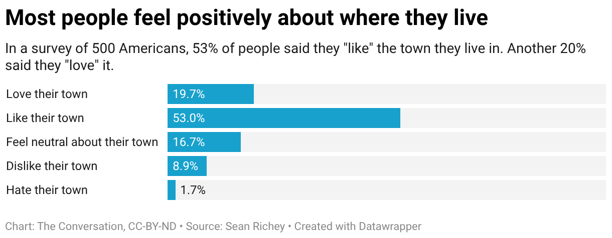 In a survey of 500 Americans, 53% of people said they "like" the town they live in. Another 20% said they "love" it.